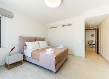 In the spacious two bedrooms, of the main house of Villa White, our guests will enjoy comfortable queen-size double beds with satellite TV and built-in wardrobes. Both bedrooms have luxury ensuite bathrooms. The bedrooms offer views of the sea, the swimming pool, and the outdoor seating areas.